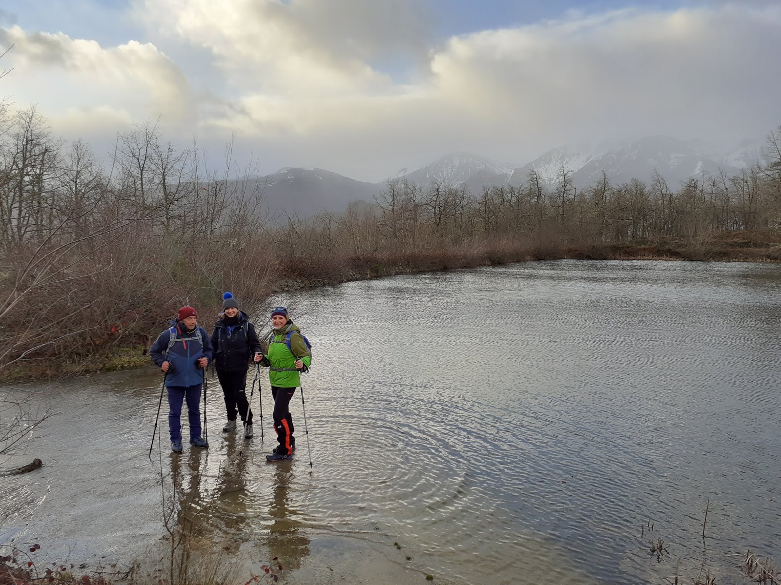 Cuatro buenas patas para un banco. Posando en Jano y con el fondo de la Ventosa, una de nuestras citas para 2020. Nubes en Peña Sagra.